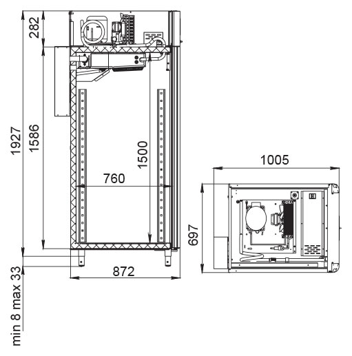 Каталог оборудования Холодильное оборудованиеШкафы холодильныеСпециализированные холодильные шкафыШкаф холодильный для вызревания салями Polair CS107 Salami черный, со стеклом Шкаф холодильный для вызревания салями Polair CS107 Salami черный, со стеклом Код товара: 062-632 Поделиться: WhatsAppTelegram СравнитьДобавить в КПВ избранное 0 373 915 ₽ В корзину 0 шт Под заказСамовывоз сегодня бесплатно Взять в кредит Купить в лизинг Получить консультацию в WhatsApp Описание Характеристики Отзывы 0 Инструкции 5 Шкаф холодильный для вызревания салями Polair CS107 Salami черный, со стеклом предназначен для приготовления и хранения салями, сыровяленых колбас и других мясных деликатесов на предприятиях общественного питания и торговли. Цельнозаливной монолитный корпус выполнен из нержавеющей стали снаружи и внутри (кроме задней стенки), что обеспечивает высокую прочность, долговечность и удобство ухода. Оборудование рассчитано на работу при температуре окружающей среды до +40 °С. Особенности: Динамическое охлаждение с мягким обдувом без заветривания Верхнее расположение агрегата Автоматическая оттайка с системой испарения конденсата Русифицированная многофункциональная панель управления с дисплеем диагональю 5" Возможность создания и сохранения индивидуальных программ Встроенный ультразвуковой увлажнитель (необходима подача очищенной воды и подключение к канализации) UV-лампа для обеззараживания воздуха внутри камеры Три уровня подвесов с тремя перекладинами и крюками на каждом уровне для удобной развески колбас Регулируемый уровень влажности: от 60 до 95 % Распашная дверь с заливной теплоизоляцией, встроенной ручкой и магнитным уплотнителем Отключаемая LED-подсветка камеры Штампованное углубление в дне корпуса для удобства ухода Педаль для удобного открытия двери Хладагент R290 (пропан) Толщина стенки корпуса: 43 мм Polair CS107 Salami черный, со стеклом — это профессиональный холодильный шкаф, идеально подходящий для цехов, гастробаров и мясных мастерских. Он обеспечивает оптимальные условия для дозревания и хранения деликатесов за счёт точного контроля температуры и влажности, продуманной конструкции и расширенного функционала. Такой шкаф помогает сохранять качество и вкус продукции на высоком уровне.Изображение товара, представленного на фото, может отличаться от его фактического вида. Показать все Габаритные размеры697×1005×1960 ммДиапазон рабочей температурыот -2 до +30 °CДлина697 ммШирина1005 ммВысота1960 ммОбъём700 лКол-во дверей1 Тип двериСтеклянная Уровень влажностиот 60 до 95 %Холодильный агрегатВстроенный Тип оттайкиАвтоматическая Тип охлажденияДинамическое ПодсветкаЕсть UV-лампаЕсть ХладагентR290 Вес нетто160 кгВес брутто190 кгБрендPolairВсе специализированные холодильные шкафы Из нержавейкиВсе специализированные холодильные шкафы Стеклянная дверь Оставить отзыв Еще никто не оставил отзыв на этот товар Схема POLAIR CS107 Salami.jpgИнструкция на POLAIR CS107 Salami.pdfБрошюра на POLAIR CS107 Salami.pdfДекларация о соответствии.pdfСертификат соответствия.pdf Похожие товары Перейти в каталог Под заказ 414 545 ₽ Шкаф холодильный для хлебопекарных производств Polair CS107-Bakery Br со стеклом (Тип 1) Под заказ 252 314 ₽ Шкаф холодильный для вызревания мяса и сыра Carboma M700GN-1-G-MHC 9005 Под заказ 248 490 ₽ Шкаф холодильный для вызревания мяса и сыра Carboma M700GN-1-G-MHC 9006 Под заказ 385 475 ₽ Шкаф холодильный для вызревания сыра Polair CS107 Che