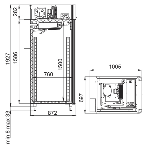 Каталог оборудования Холодильное оборудованиеШкафы холодильныеСпециализированные холодильные шкафыШкаф холодильный для вызревания салями Polair CS107 Salami со стеклом Шкаф холодильный для вызревания салями Polair CS107 Salami со стеклом Код товара: 062-631 Поделиться: WhatsAppTelegram СравнитьДобавить в КПВ избранное 0 385 050 ₽ В корзину 0 шт Под заказСамовывоз сегодня бесплатно Взять в кредит Купить в лизинг Получить консультацию в WhatsApp Описание Характеристики Отзывы 0 Инструкции 5 Шкаф холодильный для вызревания салями Polair CS107 Salami со стеклом предназначен для приготовления и хранения салями, сыровяленых колбас и других мясных деликатесов на предприятиях общественного питания и торговли. Корпус цельнозаливной конструкции выполнен из нержавеющей стали снаружи и внутри (кроме задней стенки), что обеспечивает высокую прочность и долговечность. Дверь выполнена в виде стеклопакета для удобного визуального контроля. Оборудование рассчитано на работу при температуре окружающей среды до +40 °С. Особенности: Динамическое охлаждение с мягким обдувом без заветривания Верхнее расположение агрегата Автоматическая оттайка с системой испарения конденсата Русифицированная многофункциональная панель управления с дисплеем 5" и возможностью создания и сохранения собственных программ Встроенный ультразвуковой увлажнитель (необходима подача очищенной воды и подключение к канализации) UV-лампа для обеззараживания воздуха внутри камеры 3 пары направляющих с тремя перекладинами и подвесами для колбас Регулируемый уровень влажности: от 60 до 95 % Распашная дверь с заливной теплоизоляцией, встроенной ручкой и магнитным уплотнителем Отключаемая внутренняя LED-подсветка Штампованное углубление в дне корпуса для удобства ухода Педаль для удобного открытия двери Хладагент R290 (пропан) Толщина стенки корпуса: 43 мм Polair CS107 Salami со стеклом — это профессиональный шкаф, разработанный специально для мясных деликатесов. Он обеспечивает оптимальные условия для ферментации и хранения продукции за счёт точного контроля температуры и влажности, продуманной конструкции и удобного функционала. Такой шкаф станет надёжным решением для мясных цехов, гастробаров и специализированных магазинов.Изображение товара, представленного на фото, может отличаться от его фактического вида. Показать все Габаритные размеры697×1005×1960 ммДиапазон рабочей температурыот -2 до +30 °CДлина697 ммШирина1005 ммВысота1960 ммОбъём700 лКол-во дверей1 Тип двериСтеклянная Уровень влажностиот 60 до 95 %Холодильный агрегатВстроенный Тип оттайкиАвтоматическая Тип охлажденияДинамическое ПодсветкаЕсть UV-лампаЕсть ХладагентR290 Вес нетто160 кгВес брутто190 кгБрендPolairВсе специализированные холодильные шкафы Из нержавейкиВсе специализированные холодильные шкафы Стеклянная дверь Оставить отзыв Еще никто не оставил отзыв на этот товар Схема POLAIR CS107 Salami.jpgИнструкция на POLAIR CS107 Salami.pdfБрошюра на POLAIR CS107 Salami.pdfДекларация о соответствии.pdfСертификат соответствия.pdf Похожие товары Перейти в каталог Под заказ 389 300 ₽ Шкаф холодильный для вызревания сыра Polair CS107 Cheese черный, со стеклом Под заказ 169 915 ₽ Шкаф холодильный для хлебопекарных производств Polair CS107 Bakery Bs Под заказ 118 831 ₽ Шкаф холодильный HURAKAN HKN-MA100 для созревания мяса Под заказ 391 000 ₽ Шкаф холодильный для вызревания мяса Polair CS107 Meat (Тип 2) В наличии 397 290 ₽ Шкаф холодильный дл