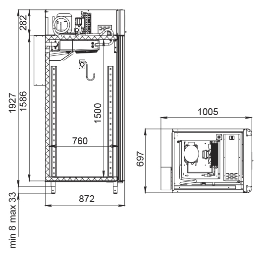 Каталог оборудования Холодильное оборудованиеШкафы холодильныеСпециализированные холодильные шкафыШкаф холодильный для вызревания сыра Polair CS107 Cheese полки окраш. Шкаф холодильный для вызревания сыра Polair CS107 Cheese полки окраш. Код товара: 062-635 Поделиться: WhatsAppTelegram СравнитьДобавить в КПВ избранное 0 385 475 ₽ В корзину 0 шт Под заказСамовывоз сегодня бесплатно Взять в кредит Купить в лизинг Получить консультацию в WhatsApp Описание Характеристики Отзывы 0 Инструкции 5 Шкаф холодильный для вызревания сыра Polair CS107 Cheese полки окраш. предназначен для создания оптимальных условий хранения и дозревания твердых и полутвердых сыров на предприятиях общественного питания и торговли. Монолитный цельнозаливной корпус изготовлен из нержавеющей стали снаружи и изнутри (за исключением задней стенки), что гарантирует высокую прочность и долговечность оборудования. Шкаф рассчитан на работу при температуре окружающей среды до 40 °С. Особенности: Верхнее расположение агрегата Многофункциональная русифицированная контрольная панель с 5-дюймовым дисплеем Возможность создания и сохранения собственных программ в памяти электронного блока Четыре сетчатые полки из окрашенной стали Встроенный ультразвуковой увлажнитель (требуется подключение к системе очищенной воды и централизованной канализации) Распашная дверь с заливной теплоизоляцией Заменяемый уплотнитель двери с магнитной вставкой Встроенная ручка для удобного открытия Отключаемая внутренняя LED-подсветка Штампованное углубление в дне корпуса для удобства ухода и очистки Надежный замок Педаль для бесконтактного открывания двери Регулировка уровня влажности от 60% до 95% Максимальная нагрузка на каждую полку — 40 кг Толщина стенки корпуса — 43 мм Polair CS107 Cheese полки окраш. — это надежное и функциональное оборудование для хранения и дозревания сыров, обеспечивающее точный контроль температуры и влажности. Прочный корпус и современный набор функций делают этот шкаф идеальным выбором для предприятий общественного питания и торговли, стремящихся поддерживать качество сырной продукции на высоком уровне.Изображение товара, представленного на фото, может отличаться от его фактического вида. Показать все Габаритные размеры697×1005×1960 ммДиапазон рабочей температурыот -2 до +30 °CДлина697 ммШирина1005 ммВысота1960 ммОбъём700 лКол-во дверей1 Тип двериМеталлическая Количество полок4 штДопустимая нагрузка на полку40 кгУровень влажностиот 60 до 95 %Холодильный агрегатВстроенный Тип оттайкиАвтоматическая Тип охлажденияДинамическое ПодсветкаЕсть ХладагентR290 Вес нетто144 кгВес брутто171 кгБрендPolairВсе специализированные холодильные шкафы Из нержавейки Оставить отзыв Еще никто не оставил отзыв на этот товар Схема POLAIR CS107 Cheese.jpgИнструкция на POLAIR CS107 Cheese.pdfБрошюра на POLAIR CS107 Cheese.pdfДекларация о соответствии.pdfСертификат соответствия.pdf Похожие товары Перейти в каталог Под заказ 207 942 ₽ Шкаф холодильный HURAKAN HKN-MA350 для созревания мяса Под заказ 252 314 ₽ Шкаф холодильный для вызревания мяса и сыра Carboma M700GN-1-G-MHC 9005 В наличии 405 365 ₽ Шкаф холодильный для хлебопекарных производств Polair CS107 Bakery Br черный, со стеклом (Тип 2) Под заказ 385 050 ₽ Шкаф холодильный для вызревания салями Polair CS107 Salami со стеклом Под заказ 389 300 ₽ Шкаф холодильный для вызревания мяса Polair CS107 Meat черный, со стеклом (Тип 1) В наличии 397 290 ₽ Шкаф холодильный для хлебоп