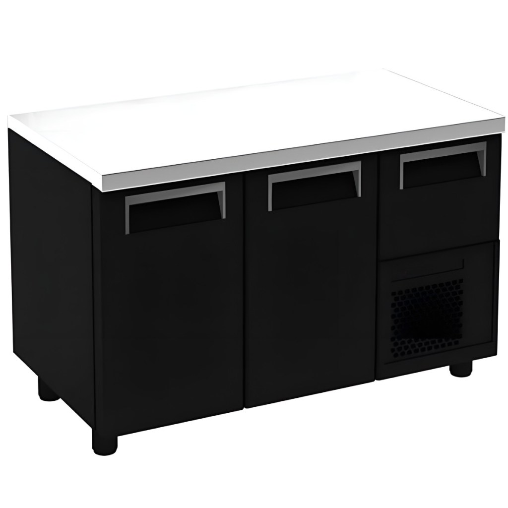 Стол холодильный барный Carboma T57 M2-1 9005-19 корпус черный, без борта, планка (BAR-250) предназначен для размещения кофемашин, а также охлаждения и хранения молока и кофейных зерен на предприятиях общественного питания и торговли.