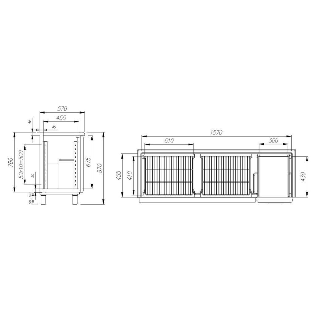 Модель оснащена 2 раздвижными дверями-купе, охлаждаемым ящиком над агрегатом, 4 полками, планкой под выбивание холдера и регулируемыми ножками высотой от 90 до 110 мм. Корпус выполнен из нержавеющей стали, дверцы — из стекла, столешница с бортом.