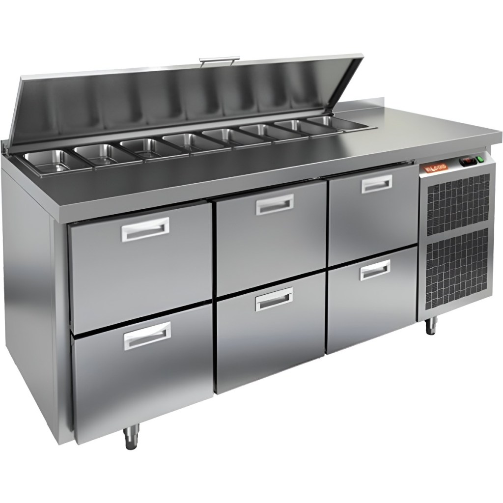 Каталог оборудования Холодильное оборудованиеСтолы охлаждаемыеСтолы холодильные для салатовСтол холодильный для салатов HiCold SL1-222SN (1/3) с крышкой Стол холодильный для салатов HiCold SL1-222SN (1/3) с крышкой Код товара: 064-846 Поделиться: WhatsAppTelegram СравнитьДобавить в КПВ избранное 0 259 642 ₽ В корзину 0 шт Под заказСамовывоз сегодня бесплатно Взять в кредит Купить в лизинг Получить консультацию в WhatsApp Описание Характеристики Отзывы 0 Стол холодильный для салатов HiCold SL1-222SN (1/3) предназначен для использования на предприятиях общественного питания и торговли. Он объединяет рабочую поверхность и охлаждаемый отсек, что делает его удобным решением для хранения, охлаждения и подготовки ингредиентов при приготовлении салатов, пиццы и других блюд. Такая конструкция позволяет повару работать быстрее и эффективнее, так как все необходимые продукты находятся под рукой. Корпус и столешница выполнены из прочной нержавеющей стали, устойчивой к коррозии и легко поддающейся санитарной обработке.Металлическая крышка защищает продукты от загрязнений и сохраняет их свежесть. Особенности модели: Электронная панель управления — точная настройка температурного режима. 6 выдвижных ящика — быстрое размещение и замена продуктов. Вместимость салат-бара — до 8 гастроемкостей глубиной до 100 мм. Автоматические доводчики — комфорт при загрузке/выгрузке. Легкозаменяемые магнитные уплотнители — надежная герметичность. Открытая агрегатная часть — быстрый доступ для обслуживания. Регулируемые по высоте ножки — устойчивость даже на неровном полу. Толщина столешницы, борта и теплоизоляции — 50 мм, что обеспечивает прочность и энергоэффективность конструкции. HiCold SL1-222SN (1/3) — практичное и удобное решение для профессиональной кухни, обеспечивающее удобную подготовку и хранение ингредиентов.Изображение товара, представленного на фото, может отличаться от его фактического вида. Показать все Габаритные размеры1835×600×850 ммДиапазон рабочей температурыот +2 до +10 °CРасположение агрегатаБоковое Материал столешницыНержавеющая Тип столаС ящиками Объём435 лТип гастроемкостейGN 1/3 Количество ящиков6 штНапряжение220 ВМощность0,46 кВтТип охлажденияДинамическое Тип оттайкиАвтоматическая СтолешницаС бортом Габариты в упаковке2000×750×1000 ммВес нетто120 кгВес брутто175 кгБрендHicold Оставить отзыв Еще никто не оставил отзыв на этот товар Ранее просмотрено Под заказ 163 161 ₽ Стол холодильный для салатов HiCold SL1-111SN (1/3) О без крышки Под заказ 305 992 ₽ Стол холодильный для салатов HiCold SL1-333GN (1/3) с крышкой Под заказ 143 721 ₽ Стол холодильный для салатов HiCold SL1-11GN (1/3) О с крышкой