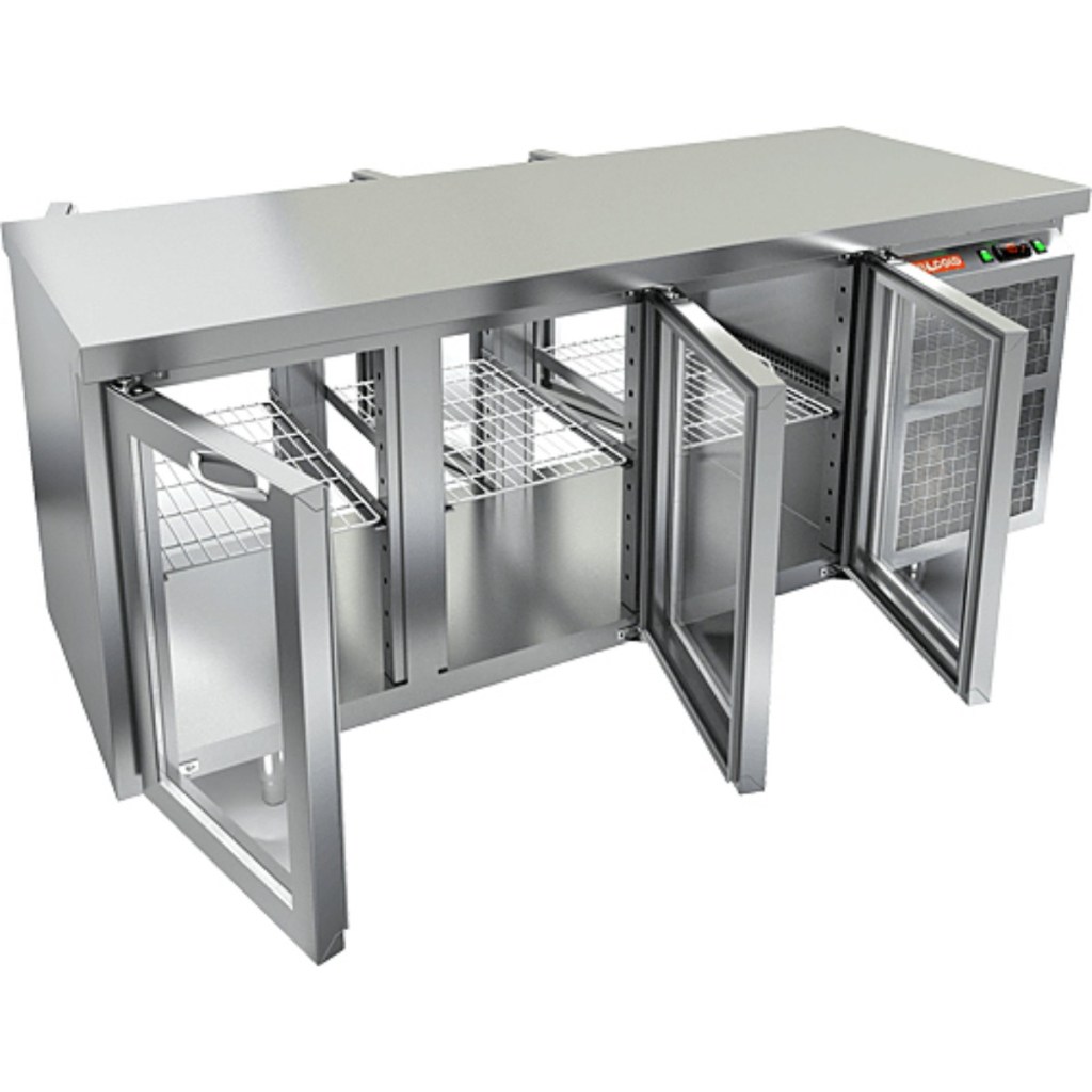 Распашные стеклянные двери с двух сторон (по 3 с каждой) — обеспечивают обзор содержимого и доступ с обеих сторон, что особенно удобно для работы в динамичной кухонной среде.