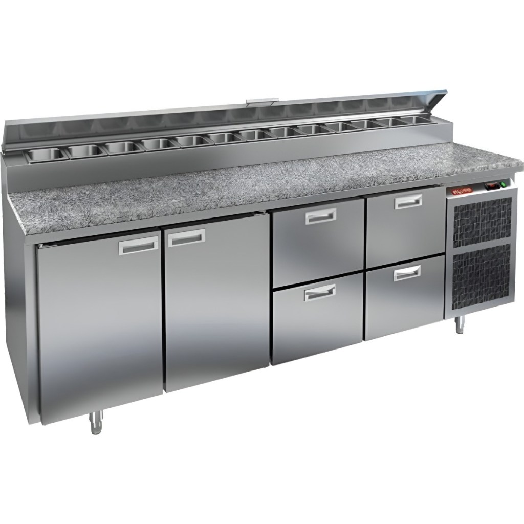 Стол холодильный для пиццы HiCold PZ2-1122GN (1/6) камень предназначен для кухонь и предприятий общественного питания. Он используется для раскатки теста, подготовки ингредиентов для пиццы, салатов и других блюд, а также для охлаждения и кратковременного хранения скоропортящихся продуктов. Модель совмещает гранитную рабочую поверхность и охлаждаемый отсек с 2 дверями и 4 ящиками, обеспечивая удобный доступ к ингредиентам и эффективное хранение.