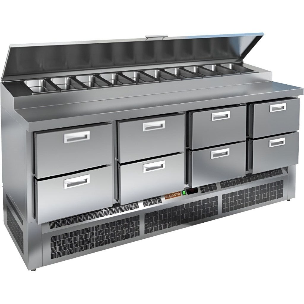 Каталог оборудования Холодильное оборудованиеСтолы охлаждаемыеСтолы холодильные для пиццыСтол холодильный для пиццы HiCold PZE1-2222GN (1/3) Стол холодильный для пиццы HiCold PZE1-2222GN (1/3) Код товара: 064-726 Поделиться: WhatsAppTelegram СравнитьДобавить в КПВ избранное 0 342 622 ₽ В корзину 0 шт Под заказСамовывоз сегодня бесплатно Взять в кредит Купить в лизинг Получить консультацию в WhatsApp Описание Характеристики Отзывы 0 Стол холодильный для пиццы HiCold PZE1-2222GN (1/3) — профессиональное оборудование для предприятий общественного питания и торговли. Он предназначен для раскатки теста и подготовки ингредиентов, используемых при приготовлении пиццы, салатов и других блюд, а также для охлаждения и кратковременного хранения скоропортящихся продуктов и напитков. Совмещение рабочей поверхности и охлаждаемого блока значительно упрощает работу повара — все необходимые компоненты находятся под рукой. Корпус и столешница выполнены из нержавеющей стали, обеспечивая долговечность, устойчивость к повреждениям и лёгкость ухода. Основные особенности: Динамическая система охлаждения — равномерное распределение холода по всему объёму Автоматическая оттайка — стабильная работа без образования наледи Электронная панель управления — точная настройка температуры 8 выдвижных ящика — удобная организация внутреннего пространства Автоматические доводчики ящиков — комфорт при работе Легкозаменяемые магнитные уплотнители — поддержание герметичности Открытая агрегатная часть — лёгкий доступ к техническим элементам Регулируемые по высоте ножки — установка на неровных поверхностях Максимальная глубина гастроёмкостей: 100 мм Глубина рабочей поверхности: 324 мм Толщина столешницы: 50 мм Толщина теплоизоляции: 50 мм Вместимость салат-бара: до 5 гастроёмкостей HiCold PZE1-2222GN (1/3) с четырьмя выдвижными ящиками — надёжный и функциональный холодильный стол для пиццы и салатов. Продуманная организация хранения и удобство эксплуатации обеспечивают быстрый доступ к ингредиентам и повышают производительность на профессиональной кухне.Изображение товара, представленного на фото, может отличаться от его фактического вида. Показать все Габаритные размеры1970×700×990 ммДиапазон рабочей температурыот +2 до +10 °CРасположение агрегатаНижнее Материал столешницыНержавеющая Тип столаС ящиками Объём505 лТип гастроемкостейGN 1/3 Количество ящиков8 штНапряжение220 ВМощность0,46 кВтТип охлажденияДинамическое Тип оттайкиАвтоматическая Габариты в упаковке2070×800×1260 ммВес нетто168 кгВес брутто227 кгБрендHicoldВсе холодильные столы для пиццы HicoldВсе нержавеющие холодильные столы для пиццы Оставить отзыв Еще никто не оставил отзыв на этот товар Ранее просмотрено Под заказ 206 542 ₽ Стол холодильный для пиццы HiCold PZ1-11GN (1/3) М В наличии Цена по запросу Витрина холодильная Иней LIDA-BRIZ М 3,75 Под заказ 306 172 ₽ Стол холодильный для пиццы HiCold PZ1-222GN (1/3H)