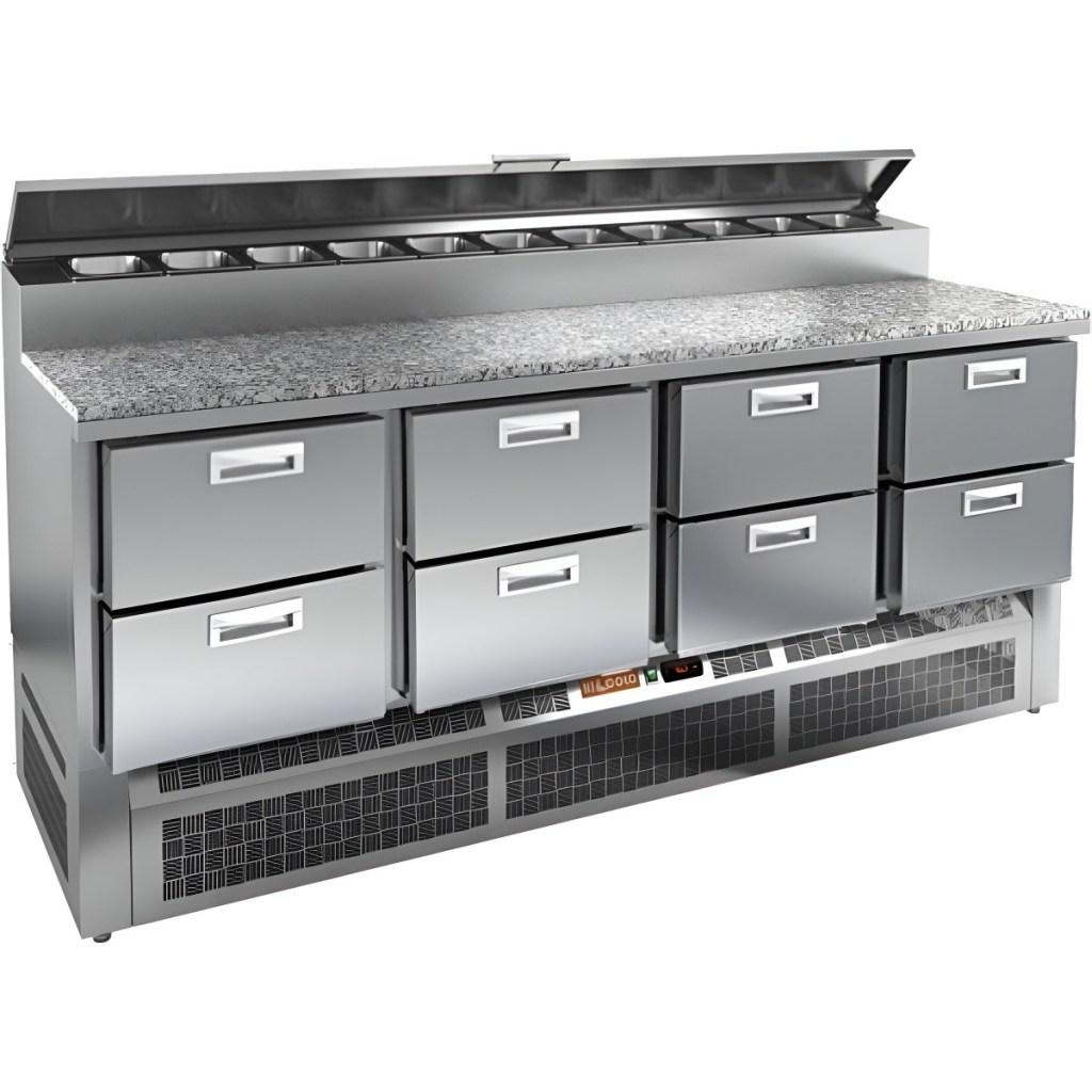 Каталог оборудования Холодильное оборудованиеСтолы охлаждаемыеСтолы холодильные для пиццыСтол холодильный для пиццы HiCold PZE2-2222/GN (1/6H) Стол холодильный для пиццы HiCold PZE2-2222/GN (1/6H) Код товара: 064-964 Поделиться: WhatsAppTelegram СравнитьДобавить в КПВ избранное 0 342 622 ₽ В корзину 0 шт Под заказСамовывоз сегодня бесплатно Взять в кредит Купить в лизинг Получить консультацию в WhatsApp Описание Характеристики Отзывы 0 Стол холодильный для пиццы HiCold PZE2-2222/GN (1/6H) предназначен для использования на предприятиях общественного питания и торговли. Он совмещает охлаждаемый объём и удобную рабочую поверхность, обеспечивая повару быстрый доступ к ингредиентам и комфорт при подготовке блюд — от пиццы и салатов до закусок и десертов. Модель отличается прочной и гигиеничной конструкцией: корпус и столешница изготовлены из нержавеющей стали, что гарантирует износостойкость и лёгкость в уходе даже при интенсивной эксплуатации. Ключевые особенности: Электронная панель управления – точная регулировка температурного режима 8 выдвижных ящиков — позволяют удобно распределить ингредиенты и оптимально организовать пространство для хранения продуктов Салат-бар на 10 гастроемкостей – удобное размещение и быстрый доступ к ингредиентам Автоматические доводчики дверей с фиксатором открытого положения – комфорт при работе Легкозаменяемые магнитные уплотнители – надёжная герметизация и простота обслуживания Открытая агрегатная часть – лёгкий доступ для технического обслуживания Регулируемые по высоте ножки – устойчивость на разных типах покрытия Максимальная глубина гастроемкостей: 100 мм Глубина рабочей поверхности: 486 мм Толщина столешницы: 50 мм Hicold PZE2-2222/GN (1/6H) — универсальный стол для пиццы, сочетающий вместительное охлаждение и рабочую поверхность из нержавеющей стали. Подходит для ресторанов, кафе и пиццерий, где важно удобство, гигиена и надёжность оборудования.Изображение товара, представленного на фото, может отличаться от его фактического вида. Показать все Габаритные размеры1970×700×990 ммДиапазон рабочей температурыот +2 до +10 °CРасположение агрегатаНижнее Материал столешницыНержавеющая Тип столаС ящиками Объём505 лТип гастроемкостейGN 1/6 Количество ящиков8 штРазмер полки530×325 ммНапряжение220 ВМощность0,46 кВтТип охлажденияДинамическое Тип оттайкиАвтоматическая СтолешницаС бортом Габариты в упаковке2200×850×1180 ммВес нетто100 кгВес брутто135 кгБрендHicold Оставить отзыв Еще никто не оставил отзыв на этот товар Ранее просмотрено Под заказ 248 500 ₽ Камера холодильная АСК-холод КХ-13,25 (2560х2560х2720)